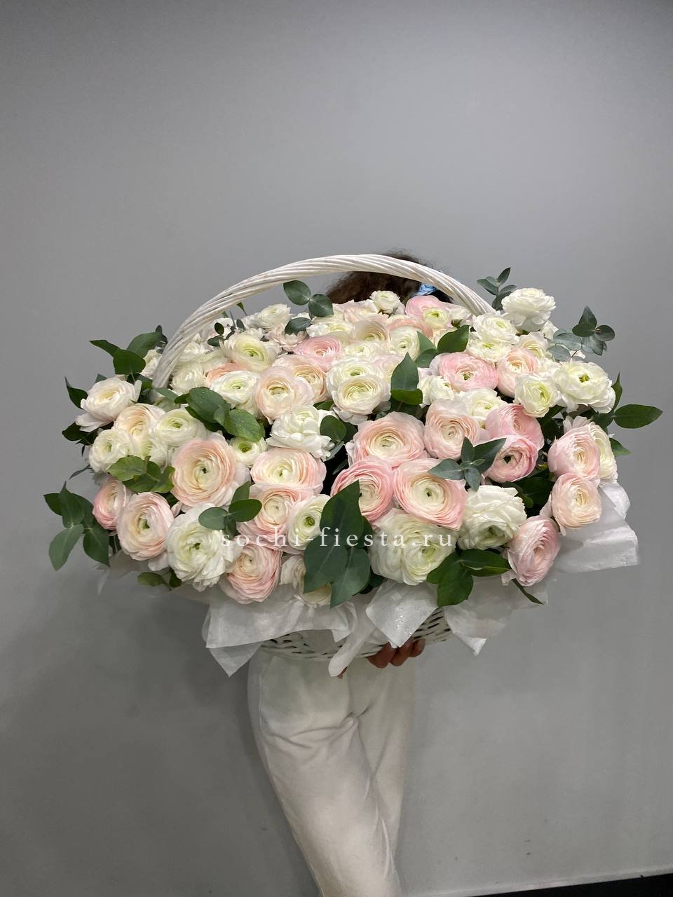Восемь видов цветов складываются в harmonичную композицию со светлой корзиной в основе. Диантусы и эустома перекликаются с розами, а гортензия задает мягкий объем всей структуре.