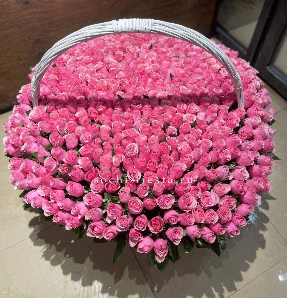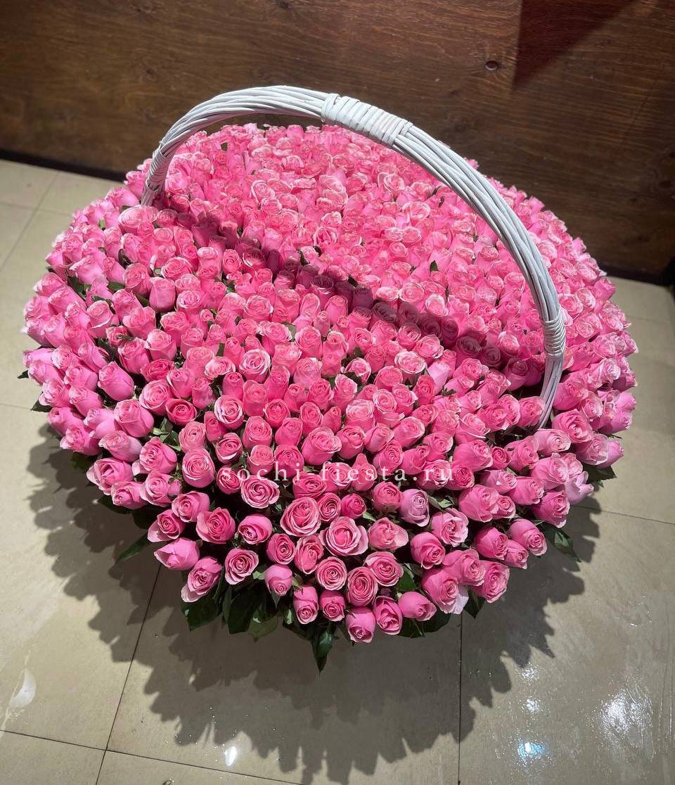 кустовые розы, одноголовые розы, диантусы,  гортензия, эустома, антиринум, озатамус, хризантема, герберы, лента, светлая корзина.Состав может меняться в зависимости от сезонности.