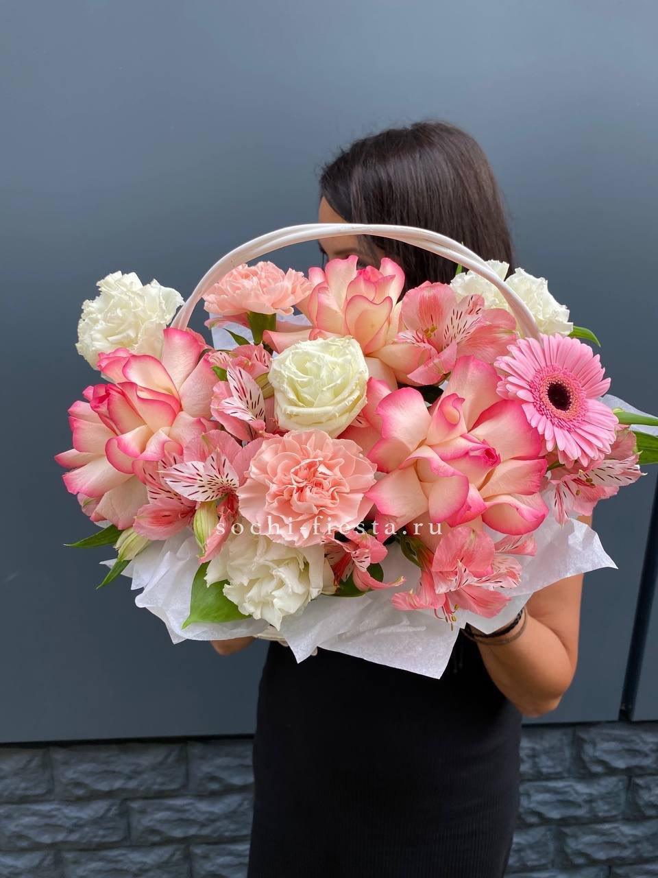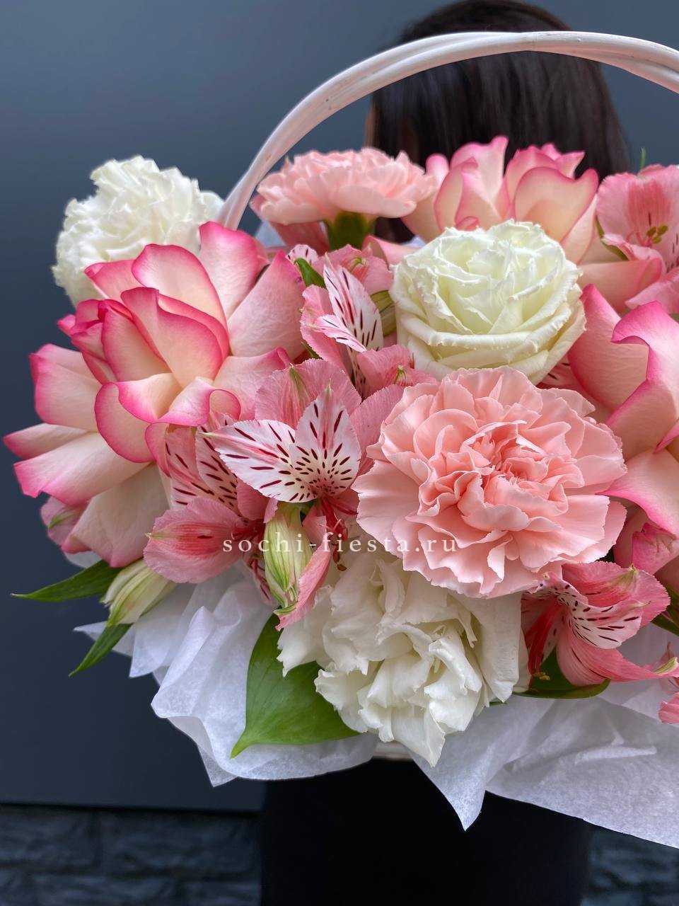 Корзина объединяет гортензии, эустомы, розы и маттиолу в многослойную композицию. Разные фактуры лепестков создают визуальную глубину и насыщенность.