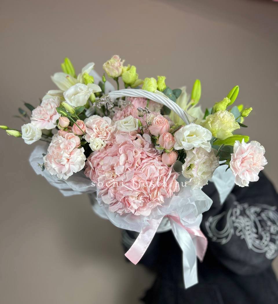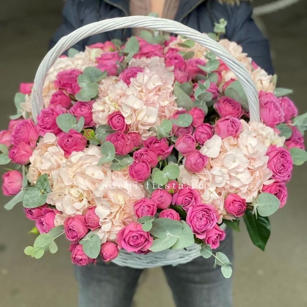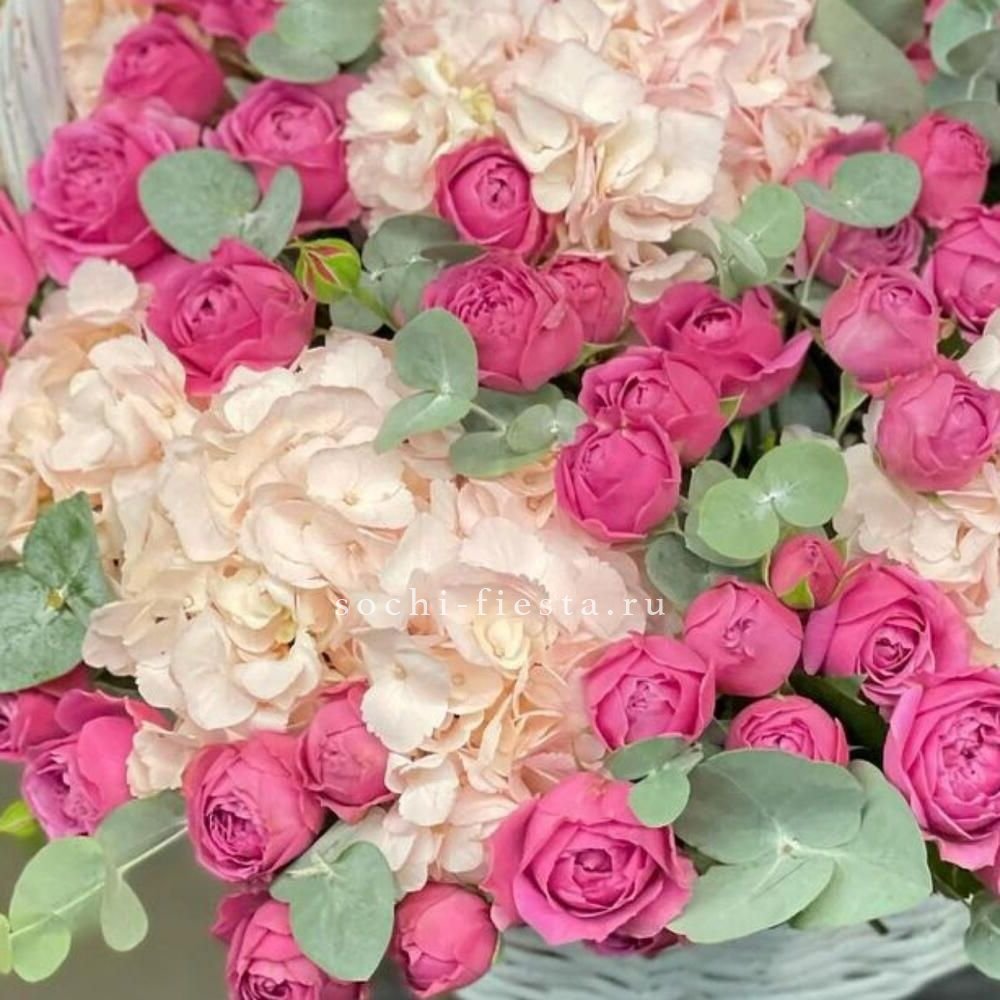 маттиола, гортензии, кустовые розы, розовые розы в корзине.