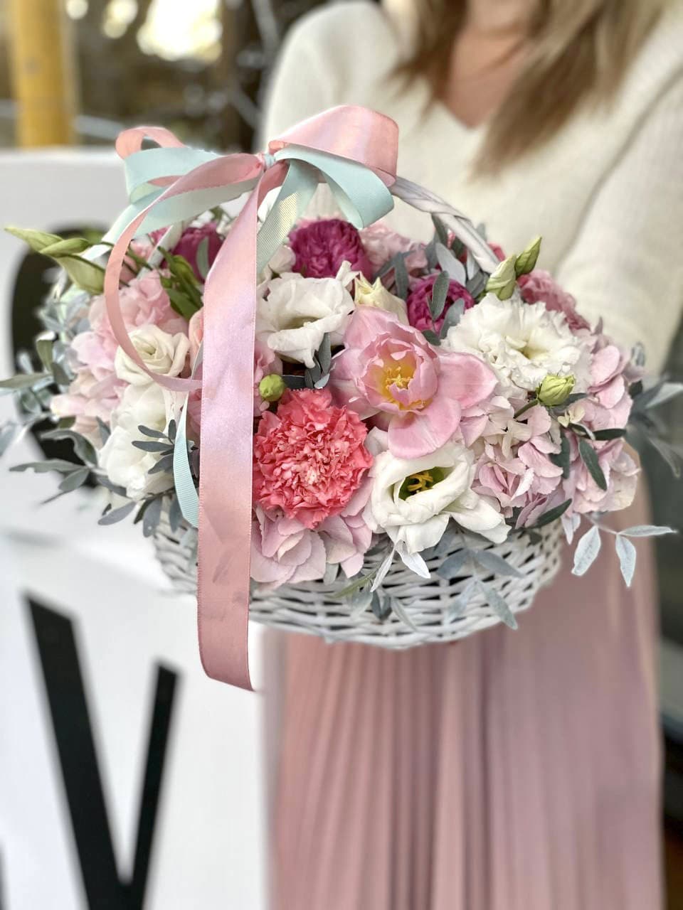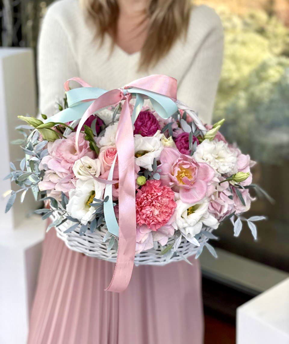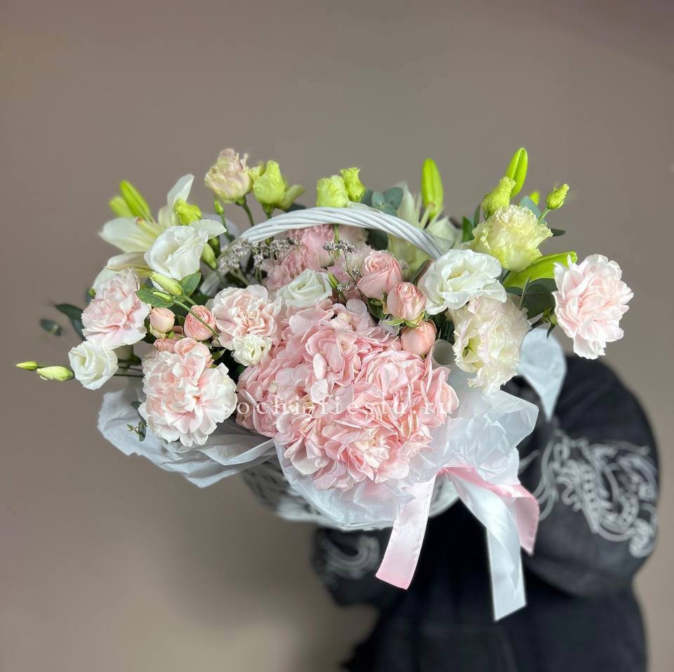 Пышная корзина с розами и гортензиями собрана плотно и объёмно. Маттиола добавляет живую текстуру между крупными соцветиями, а кустовые розы заполняют композицию мягкими переходами. Результат — впечатляющее присутствие, которое меняет восприятие пространства.