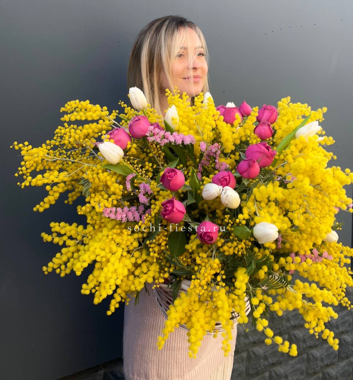 мимоза, тюльпаны, пионовидные розы мисти бабблс, статица,  оазис, корзина D30.