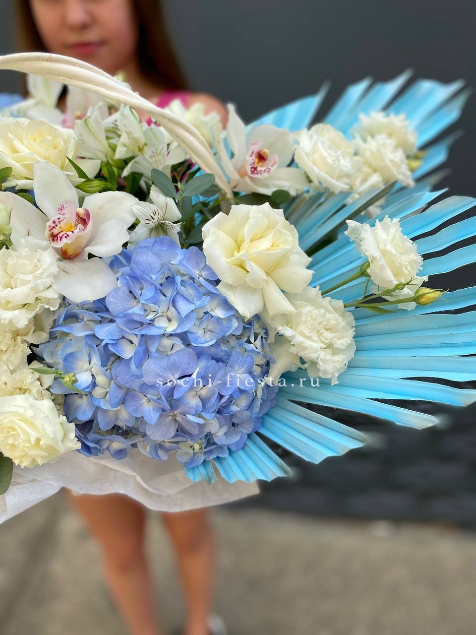 Масштабная корзина объединяет лилии, гортензии, антиринум, розы и эустому в единую объёмную композицию. Высота и насыщенность каждого слоя создают впечатление цветочного изобилия.