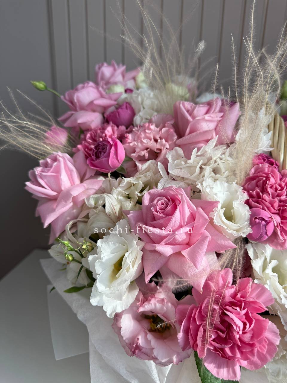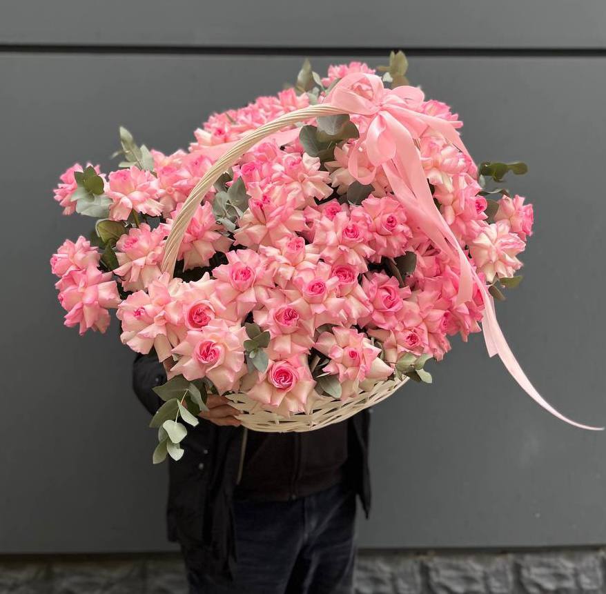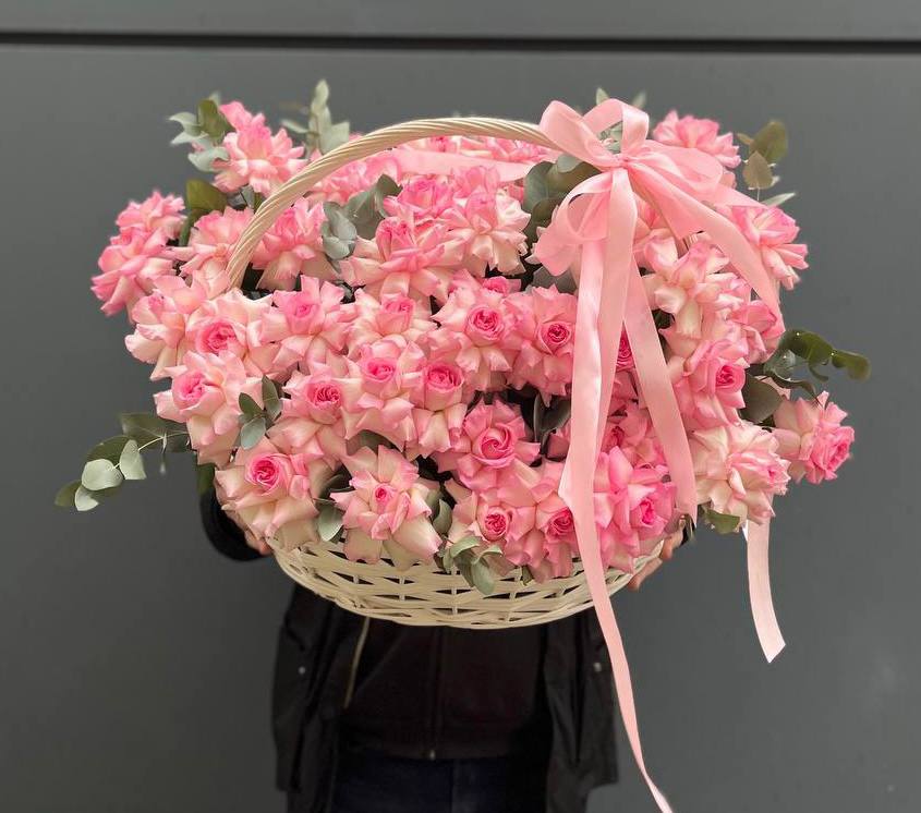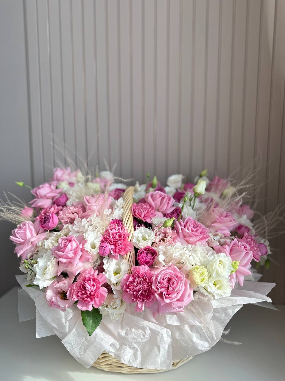 Композиция в плетёной корзине собрана из роз, эустомы, гортензии и диантуса с добавлением воздушного мисти баблс. Каждый цветок находит своё место в общем ритме, создавая гармоничную картину. Готовое решение для дома или в подарок близким.