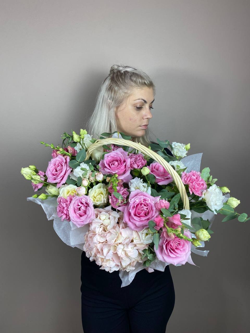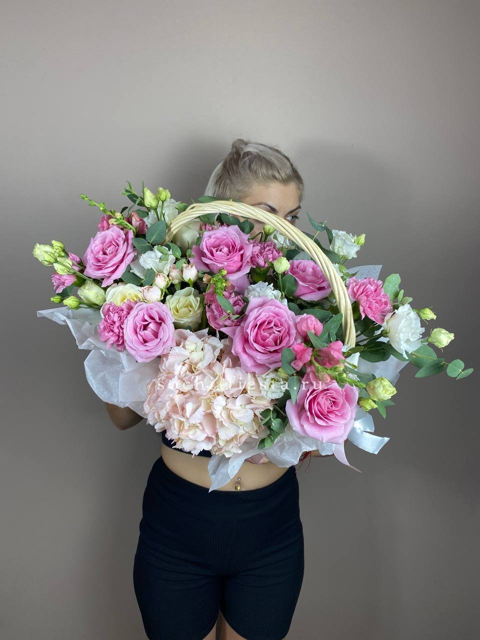 роза одноголовая, эустома, гортензия, мисти баблс, диантус, декоративная зелень, корзина D20. Итоговая корзинка может иметь композиционные отличия в зависимости от сезонности компонентов. При этом внешний вид, объем, цена компонентов, а также цветовая гамма композиции будут соответствовать оригиналу.