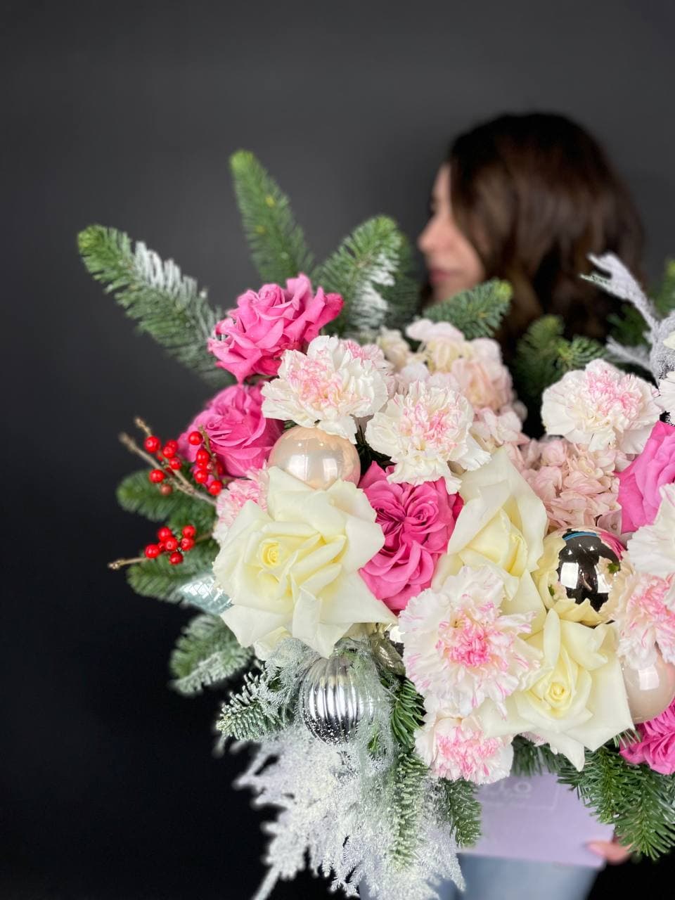ветки датского нобилиса, пионовидные розы Country Blue, розы, диантусы, илекс, набор ёлочных украшений, квадратный бокс.