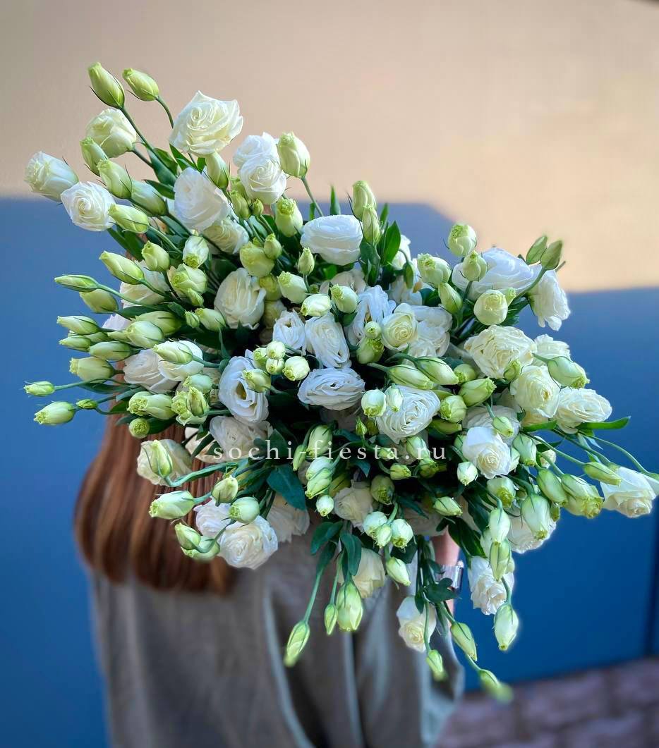 Охапка из ста одной розы – это про масштаб и драматичность момента. Белоснежные бутоны плотно собраны вместе, создавая монументальную форму. Композиция говорит сама за себя без лишних деталей.