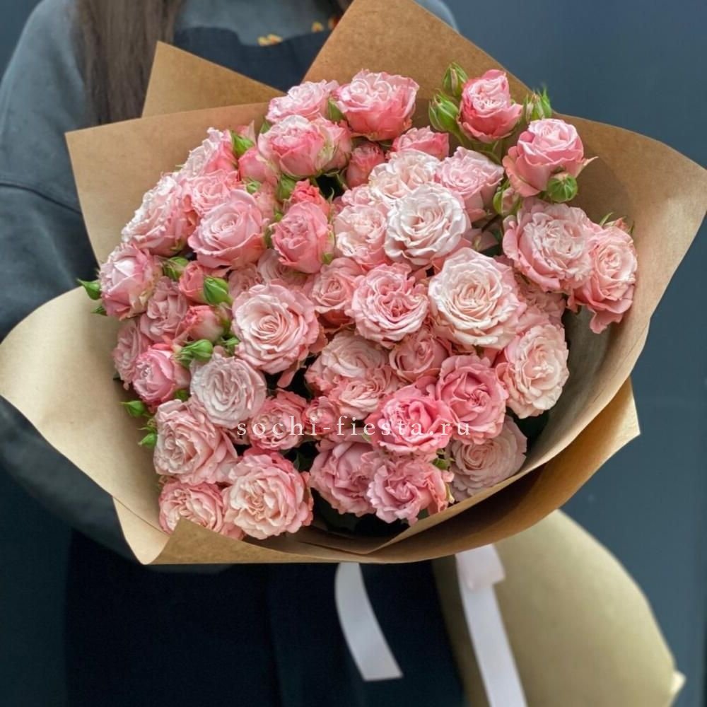 15 пионовидных кустовых роз бомбастик, лента, крафт.