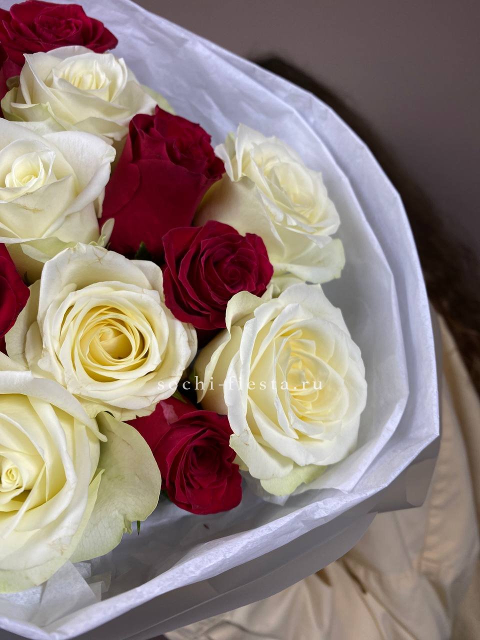 Пятнадцать роз в красно-белом исполнении собраны аккуратно и компактно. Такая композиция удобна для размещения на столе и не требует высоких ваз.