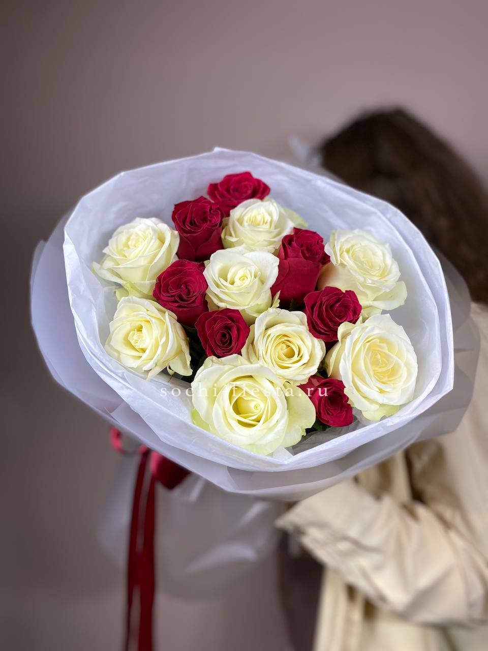 Красный и белый чередуются в свободном ритме, образуя живую композицию. Пятьдесят пять бутонов создают объёмное цветовое полотно, где каждый оттенок усиливает звучание другого.