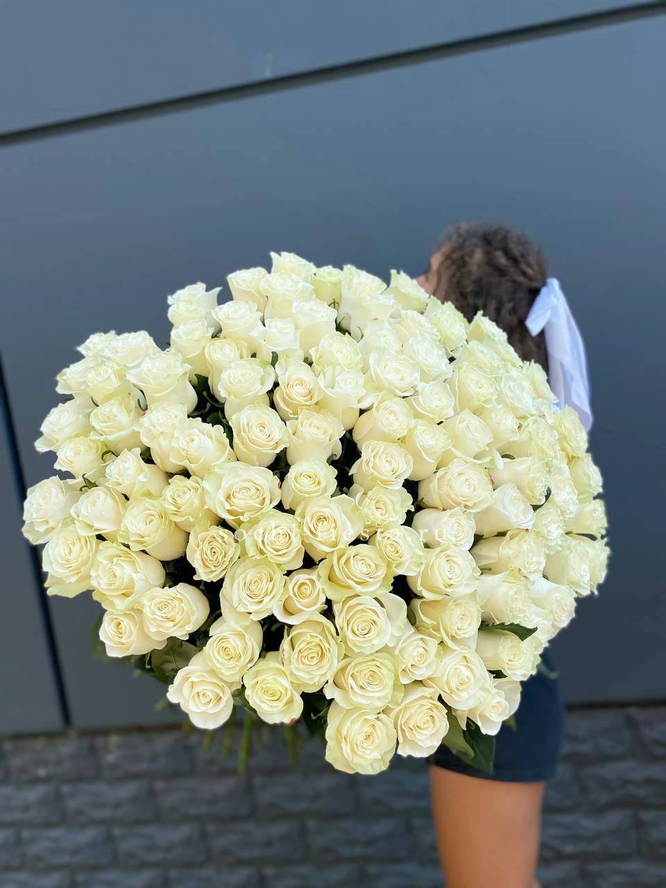101 белая роза 90см, лента.