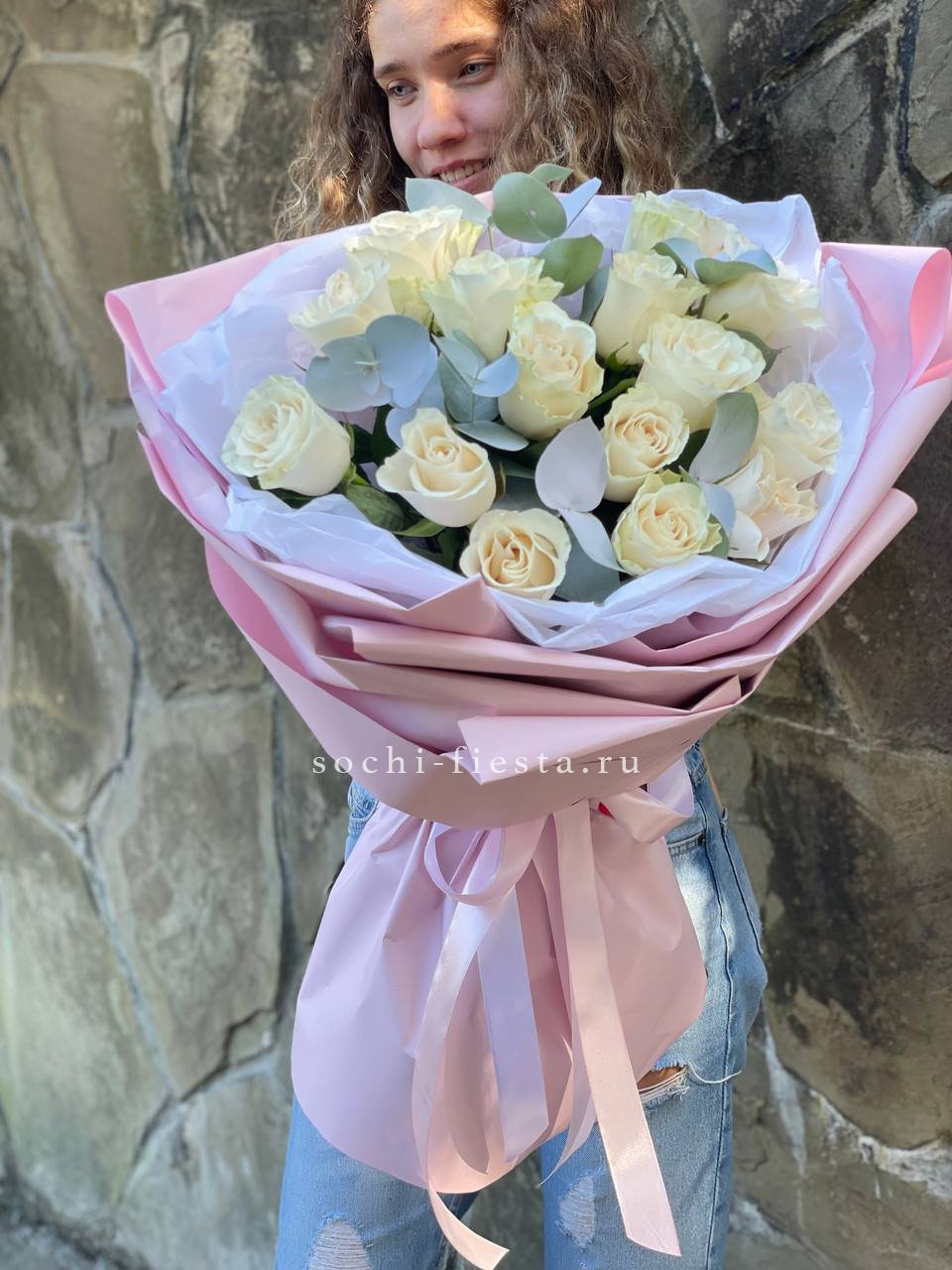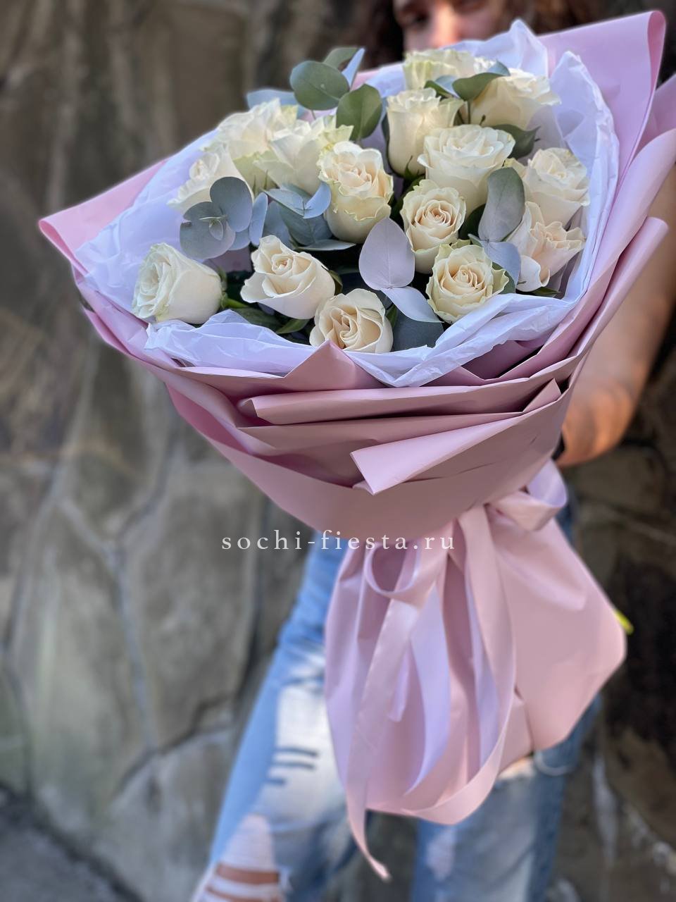 Пятнадцать белых роз собраны в аккуратную сумочку с веточками эвкалипта. Компактная форма позволяет разместить композицию на столе или полке, а матовая зелень добавляет свежести классическому белому цвету.
