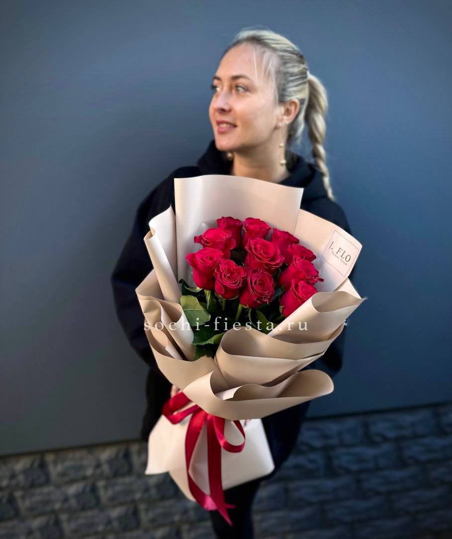 Одиннадцать роз сорта Naomi радуют глубоким красным оттенком и бархатистой поверхностью лепестков. Композиция выглядит свежо и уверенно в любом интерьере.