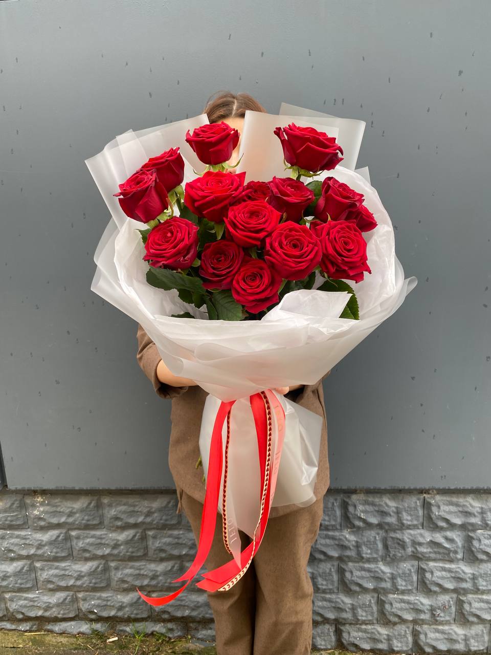 Пятнадцать красных роз в лаконичной упаковке держат безупречную вертикаль и собраны так плотно, что линия букета остаётся чёткой и графичной. Форма читается с любого угла и не теряет выразительности даже в высоких вазах.