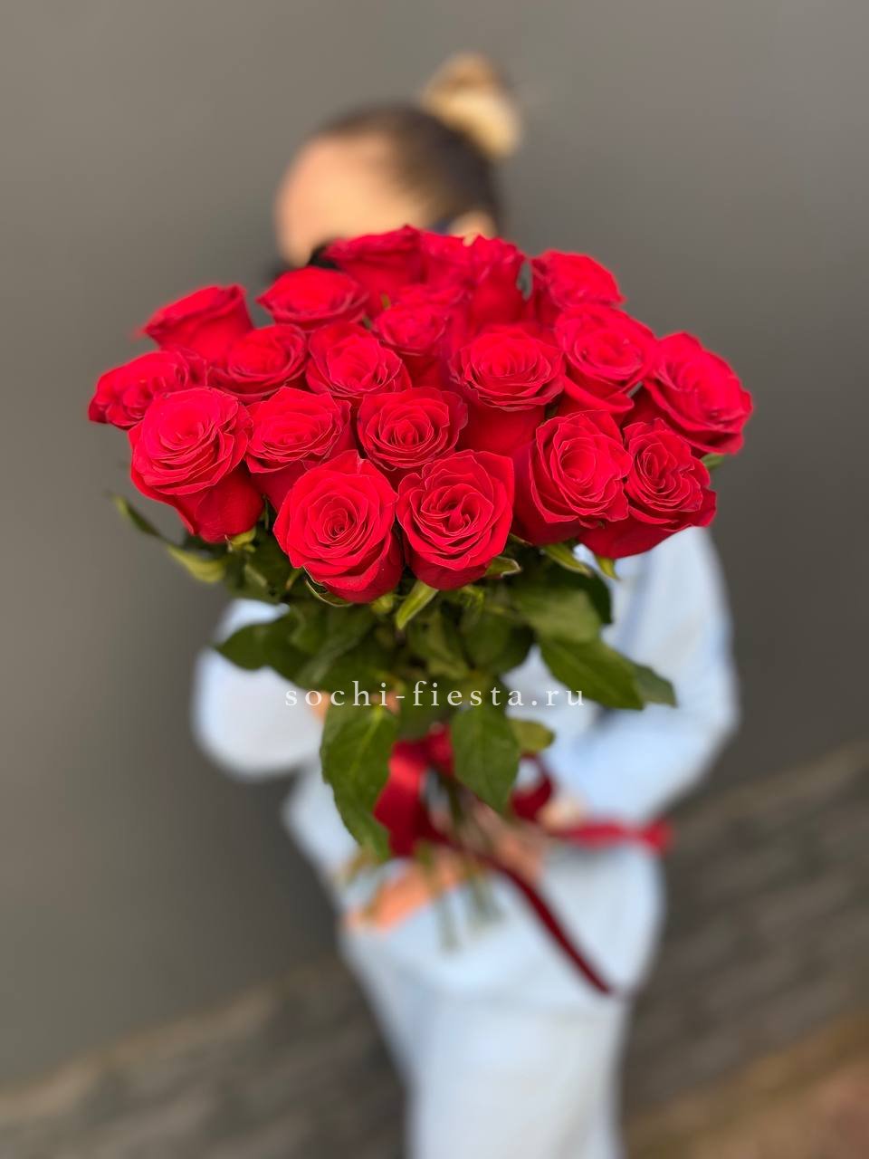 Девятнадцать бутонов насыщенного алого оттенка собраны в плотную композицию и перевязаны лентой. Классическая форма букета сохраняет свежесть и яркость надолго.