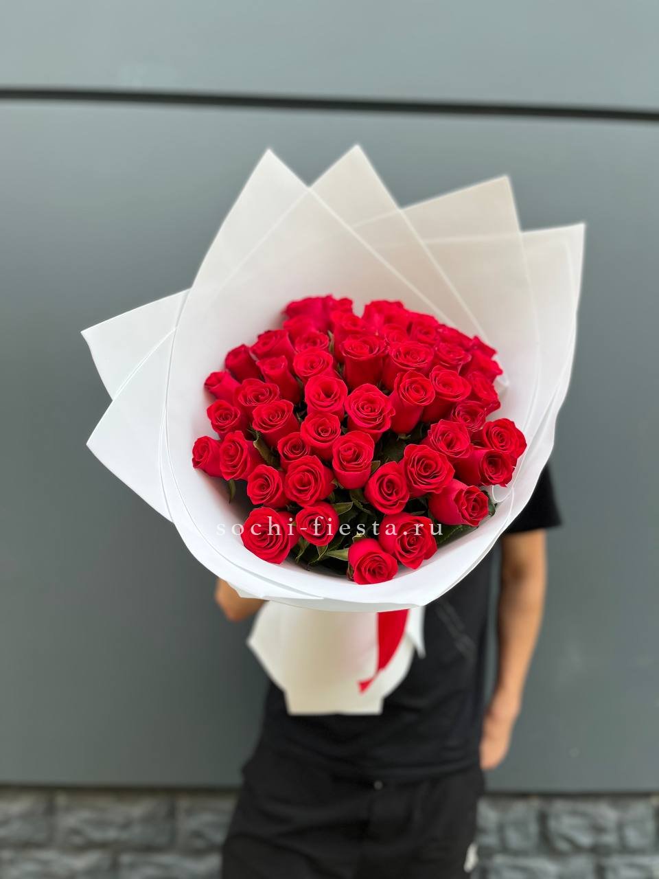 Красные розы собраны плотно и графично. Линии букета выстроены чётко, каждый бутон держит форму и создаёт общий ритм композиции.