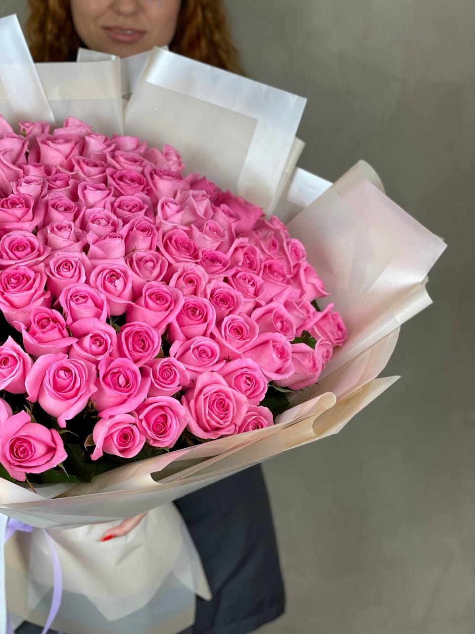роза розовая - 101 шт., лента, белая дизайнерская бумага.