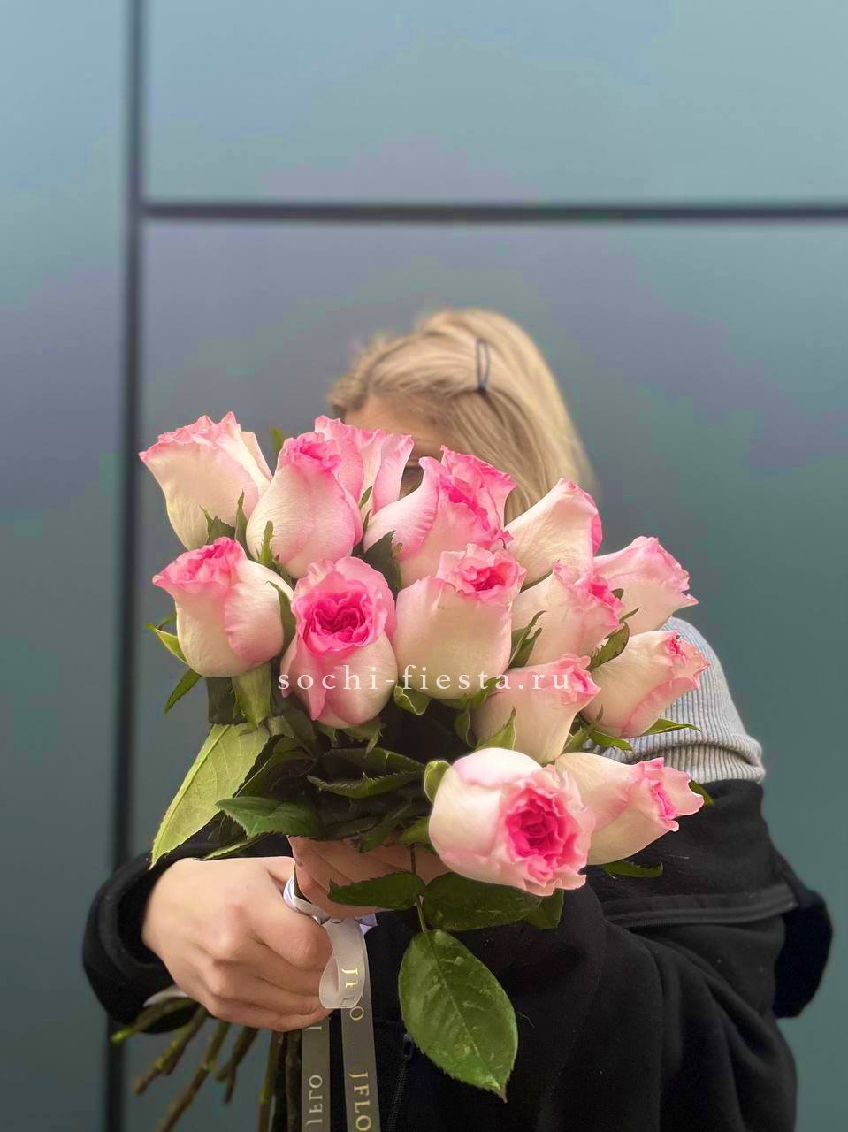 Тридцать пять стеблей формируют объемную композицию в розовой гамме. Букет занимает пространство уверенно и держит форму за счет плотной сборки. Классика, которая работает всегда.