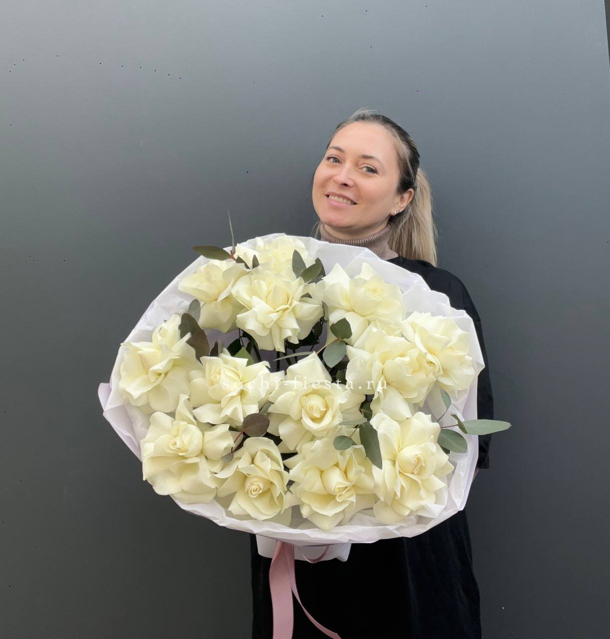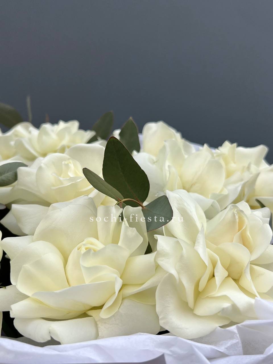 Тринадцать вывернутых французских роз сочетаются с серебристым эвкалиптом. Белые головки с волнистыми лепестками образуют воздушное облако.