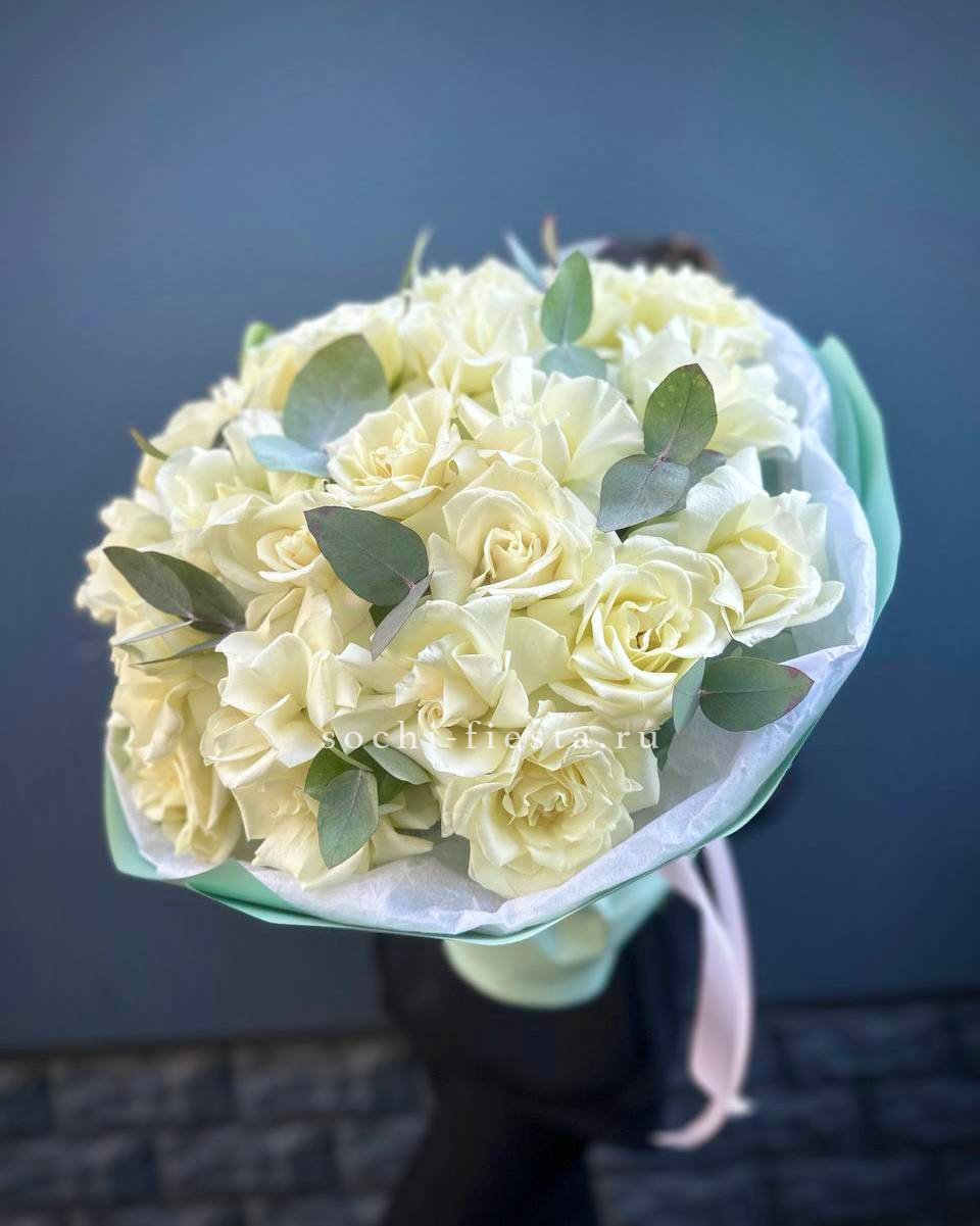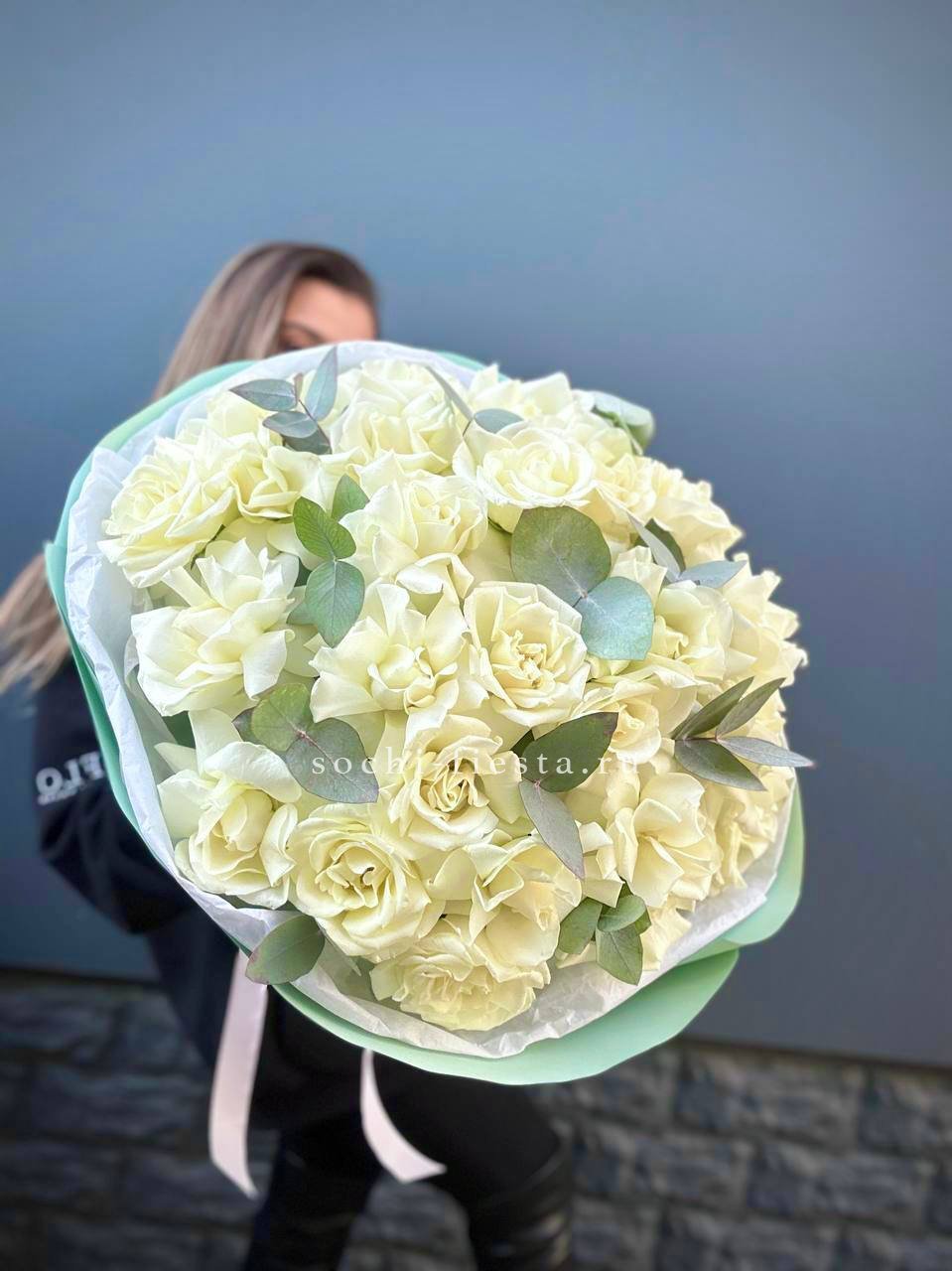 Семь вывернутых бутонов раскрываются широко и свободно, открывая слои белоснежных лепестков. Эвкалипт добавляет воздух и свежесть композиции.