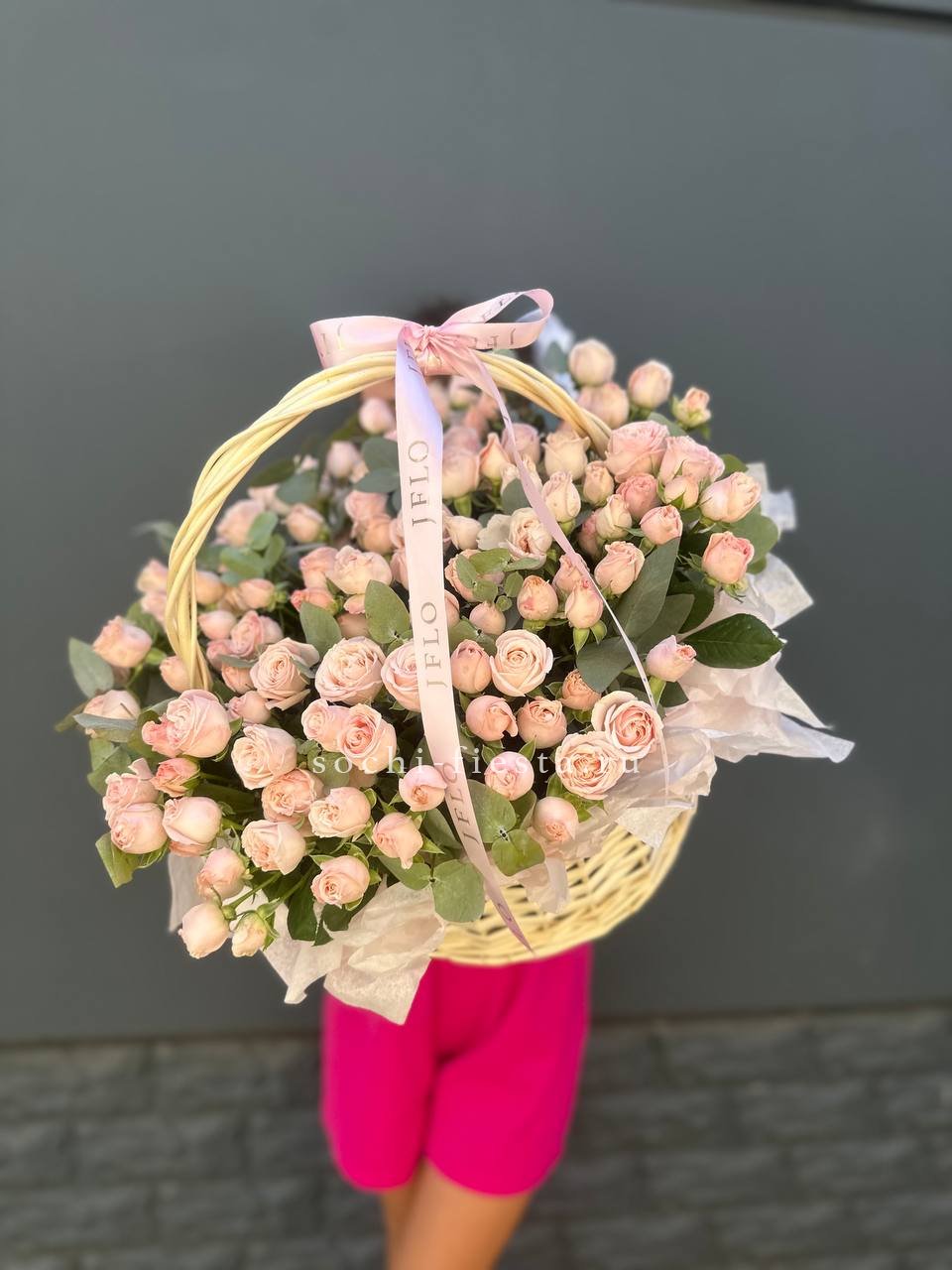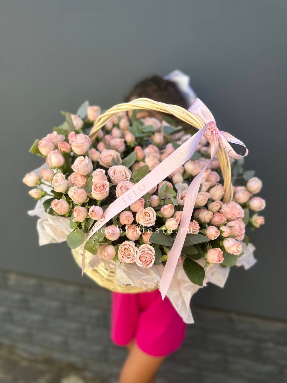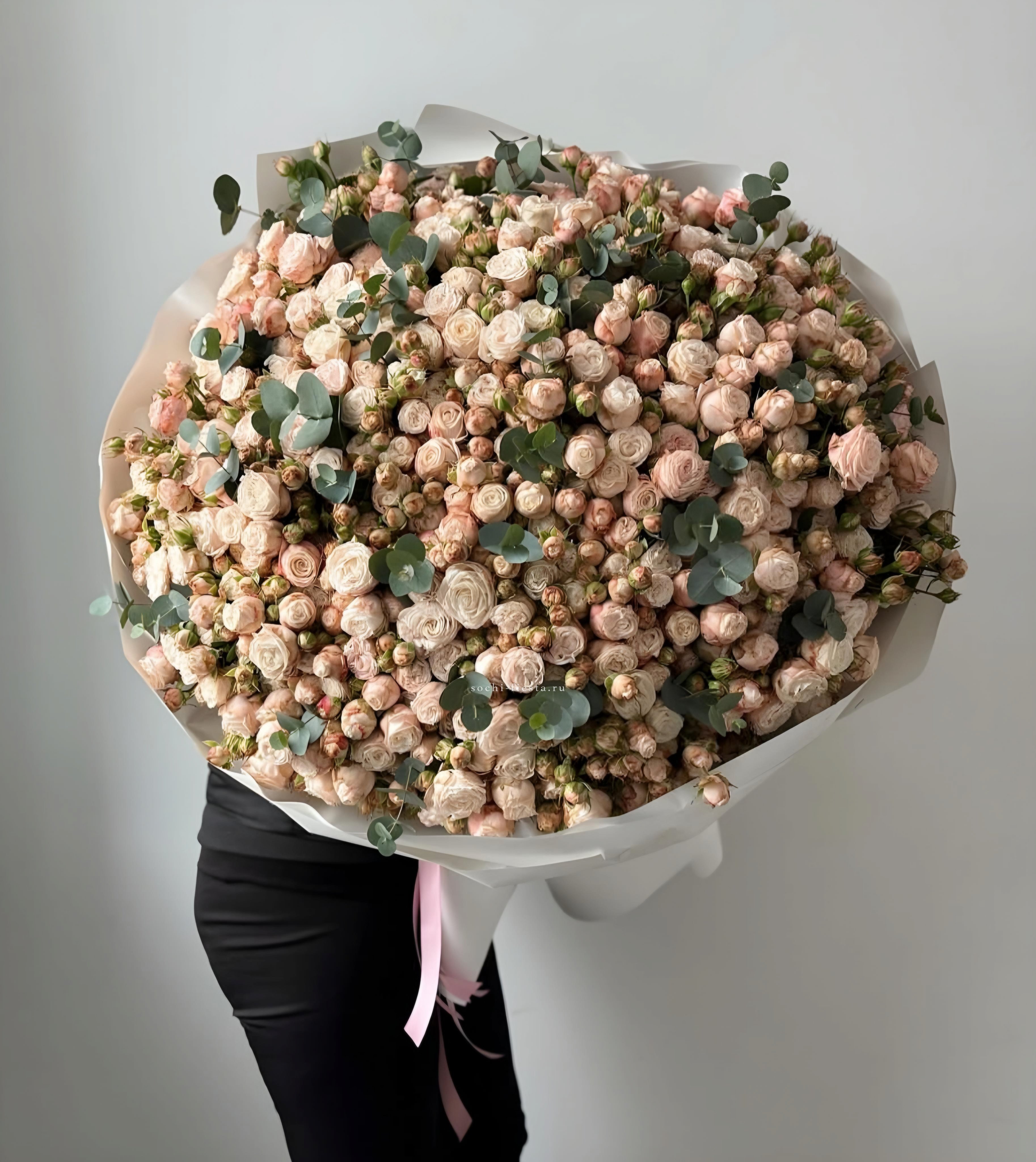 Пятнадцать кустовых роз собраны в плотную округлую форму. Мелкие бутоны создают воздушную текстуру и мягкий объём в пространстве.
