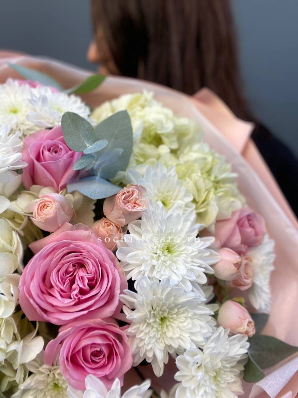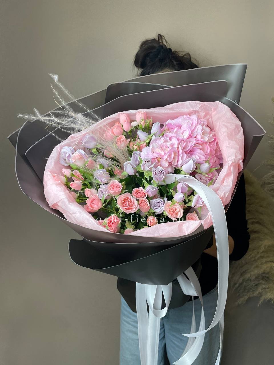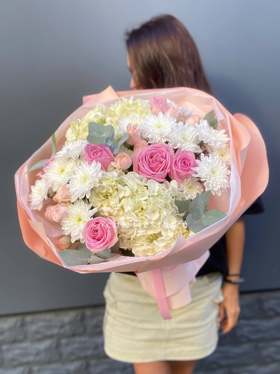 гортензия, розовые розы, диантусы, эустома, маттиолы, эвкалипт лента и дизайнерская пленка.