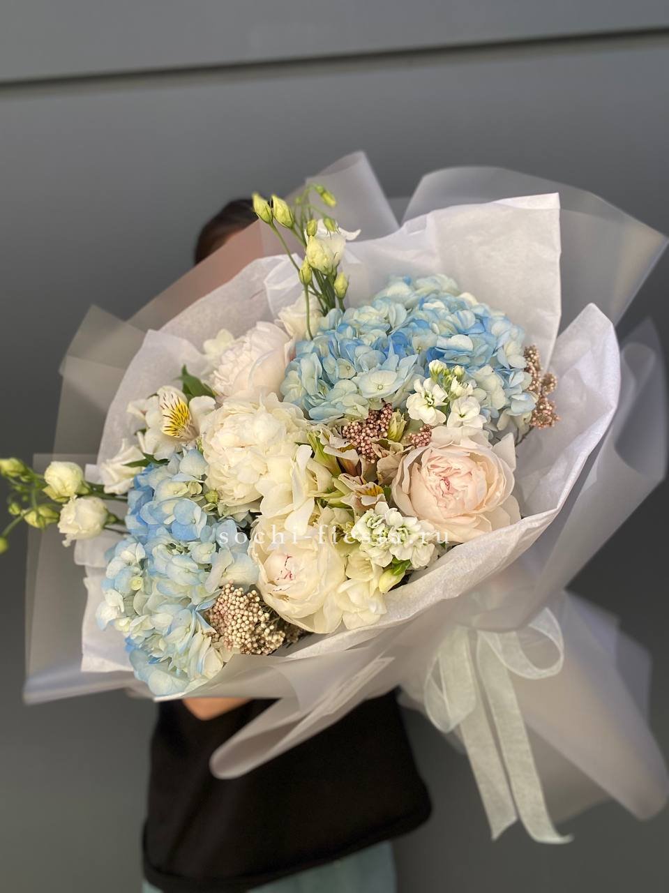 Светлая композиция собрана из пионов, гортензий и эустомы в мягкой белоснежной гамме. Воздушная форма с лёгкими переходами между соцветиями создаёт ощущение морозной свежести.