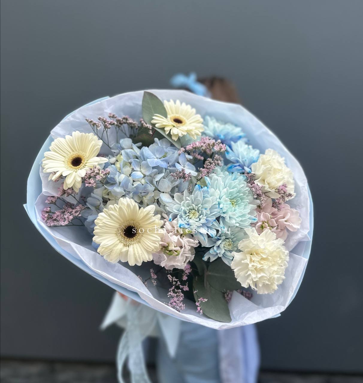 Плотная сборка с пышными соцветиями гортензии и яркими герберами создает объемный силуэт. Маттиола и лимониум добавляют воздушности по краям, а диантусы заполняют центр мягкими переходами.