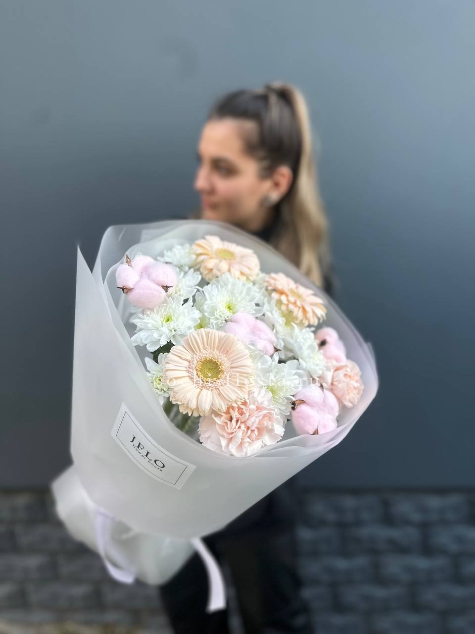 герберы, хлопок, эустома, хризантемы,  авторское оформление.