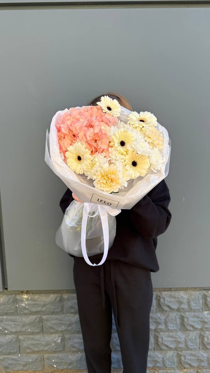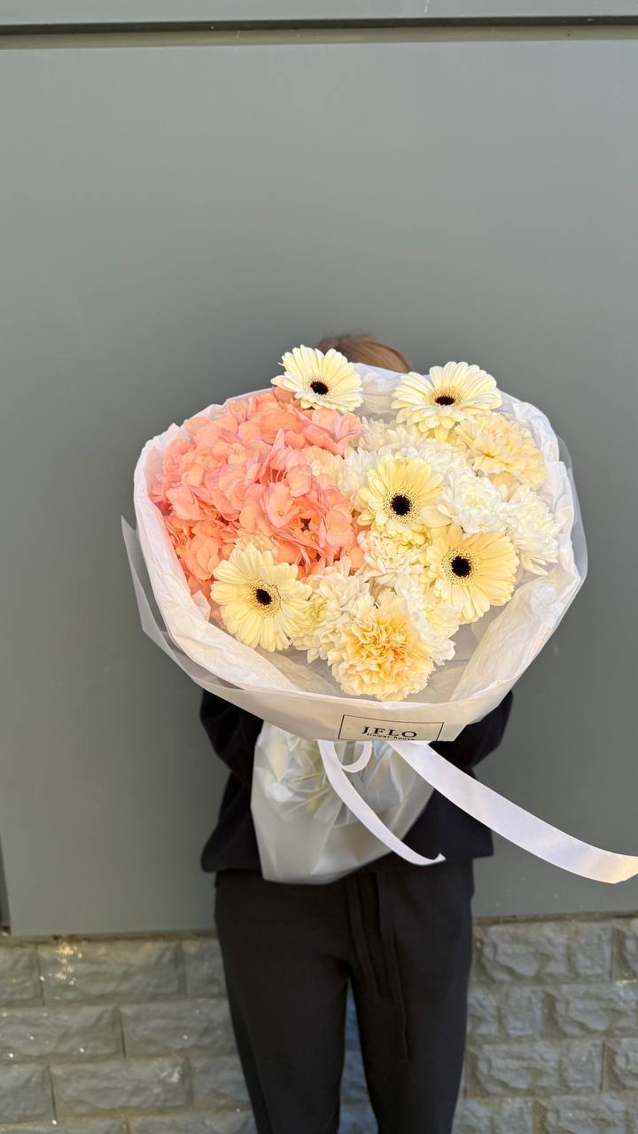 Яркая композиция объединяет пышную гортензию, игривые соцветия диантуса и солнечные хризантемы. Бомбастик добавляет объёма, а озотамнус создаёт лёгкую воздушность между крупными бутонами. Букет радует глаз насыщенными красками и жизнерадостным характером.