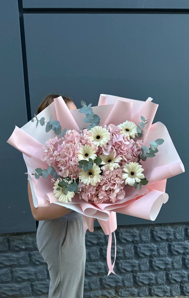 Пастельные оттенки гортензий переплетаются с белоснежными хризантемами, создавая воздушную дымку. Мягкие переходы тонов напоминают утренний туман над садом.