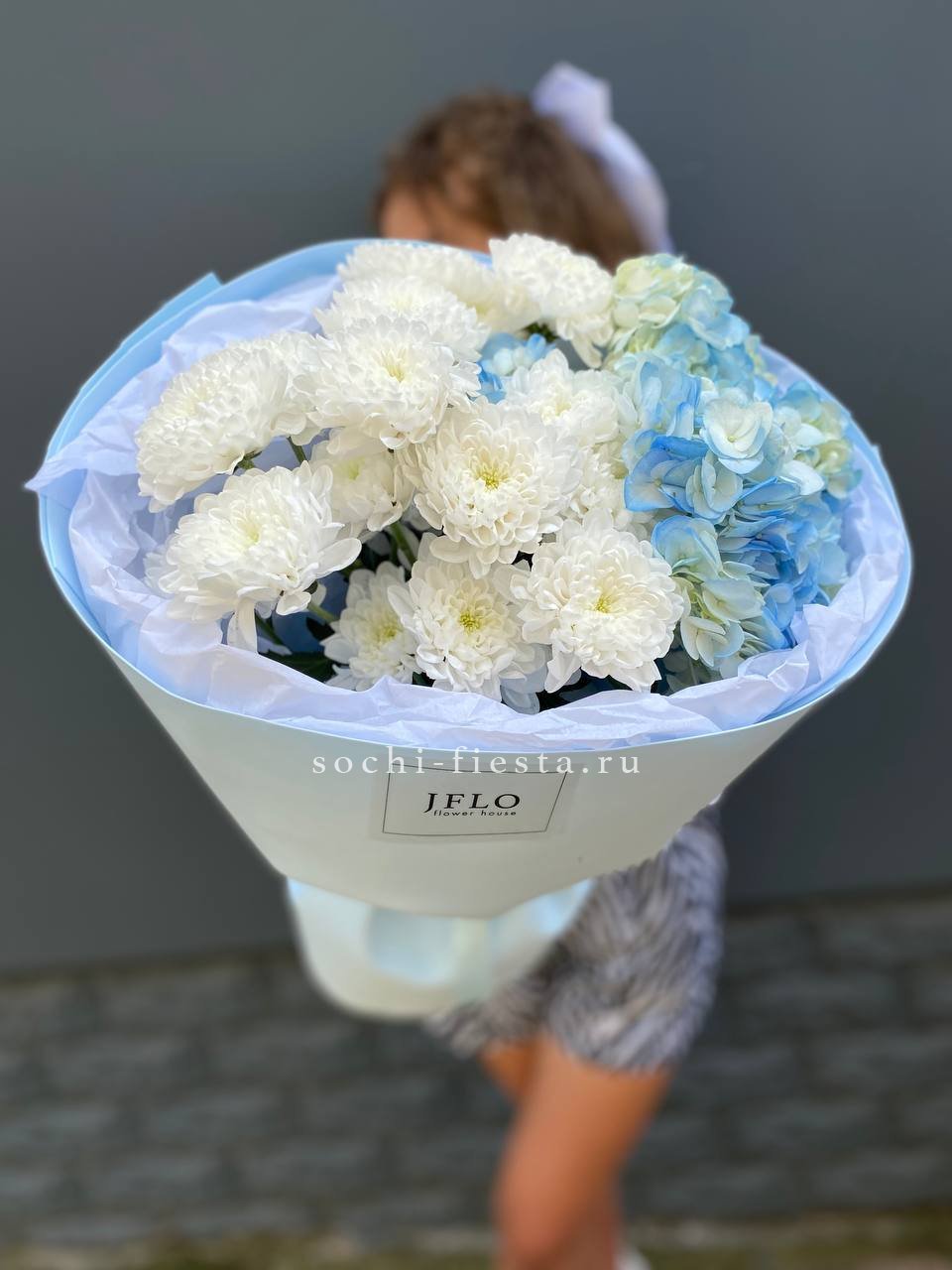 гортензии, хризантемы, лента и дизайнерская пленка.