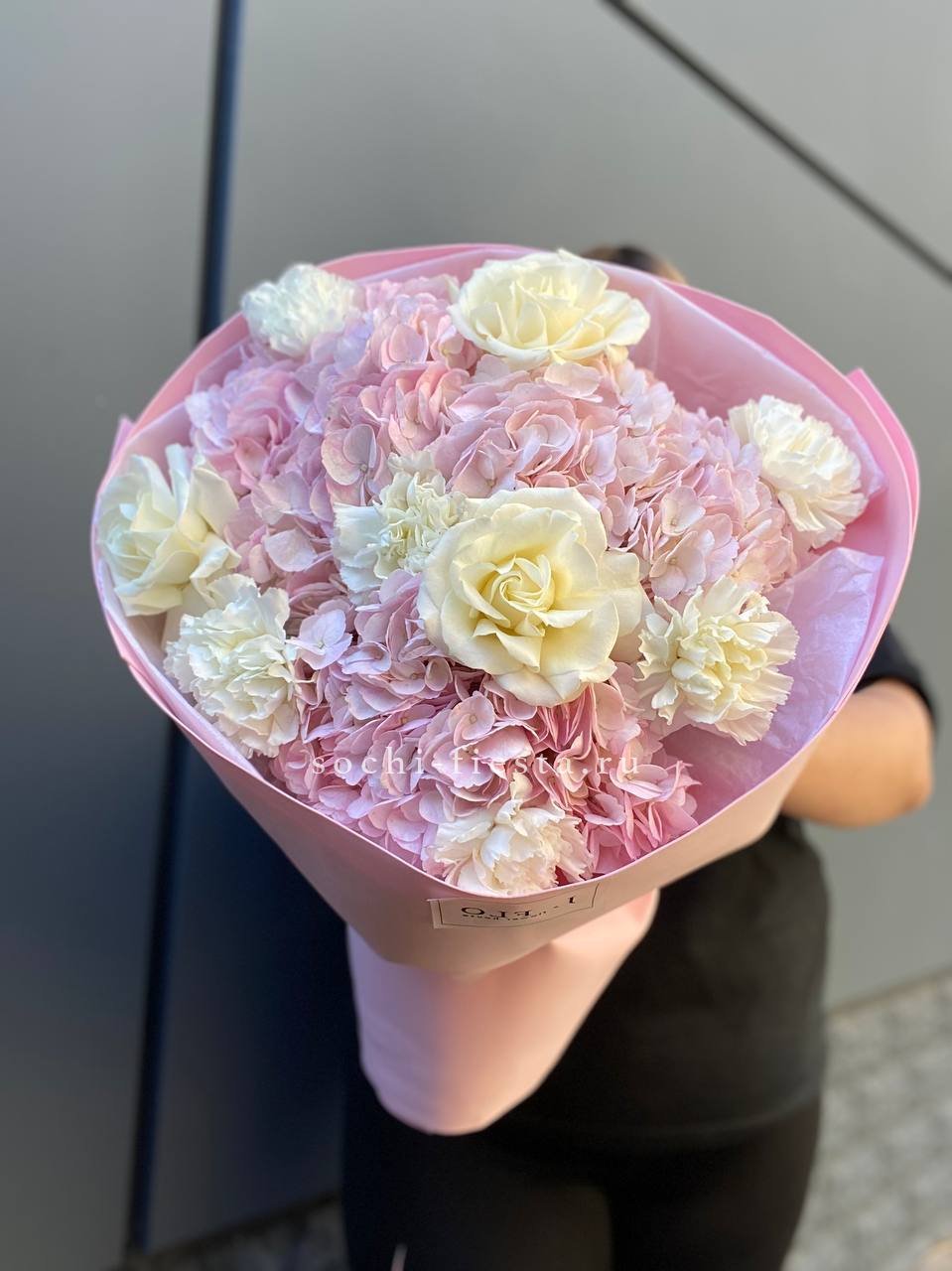 пионовидные розы, розовые пионы, диантусы, эвкалипт, лента, дизайнерская упаковка.