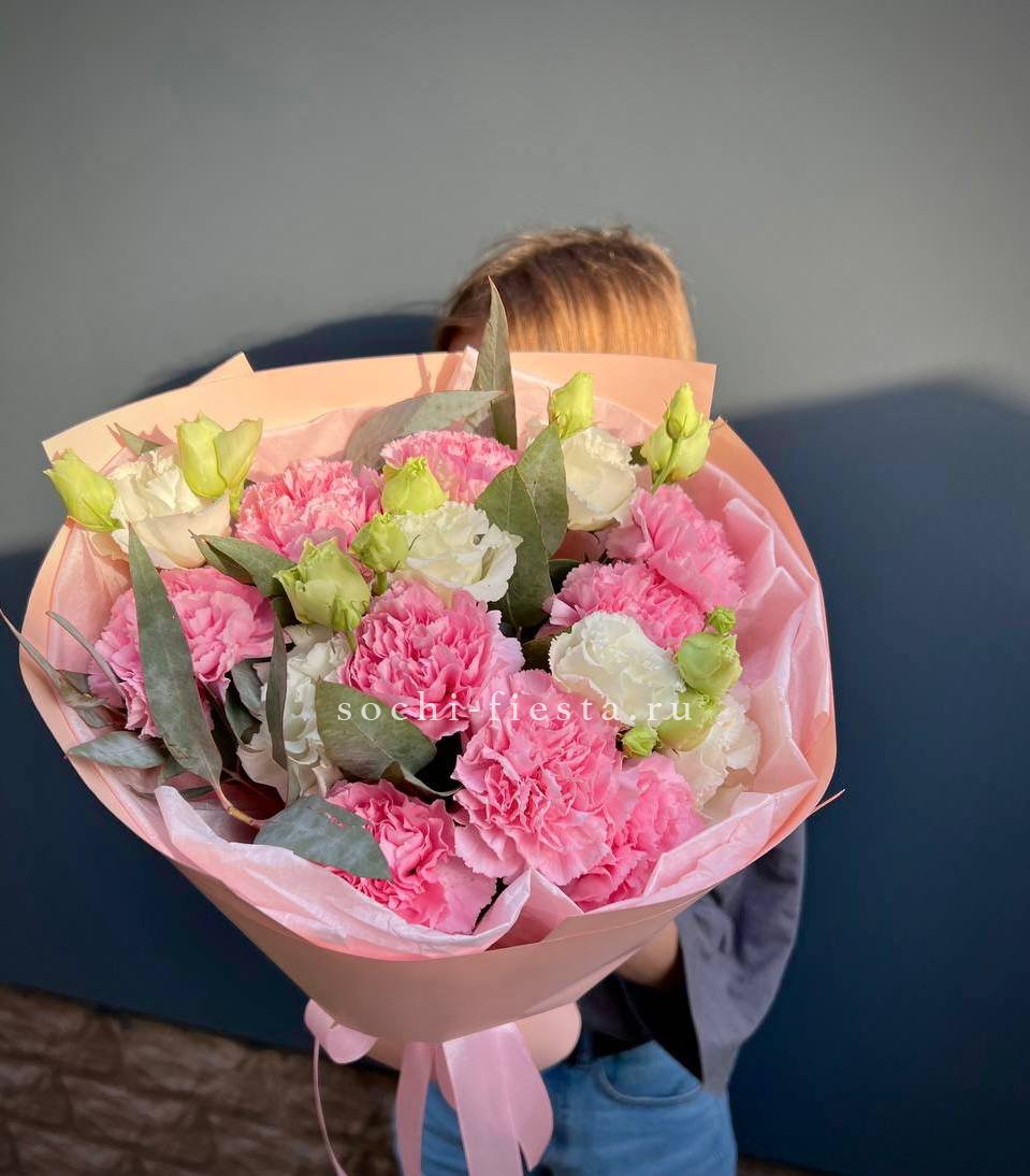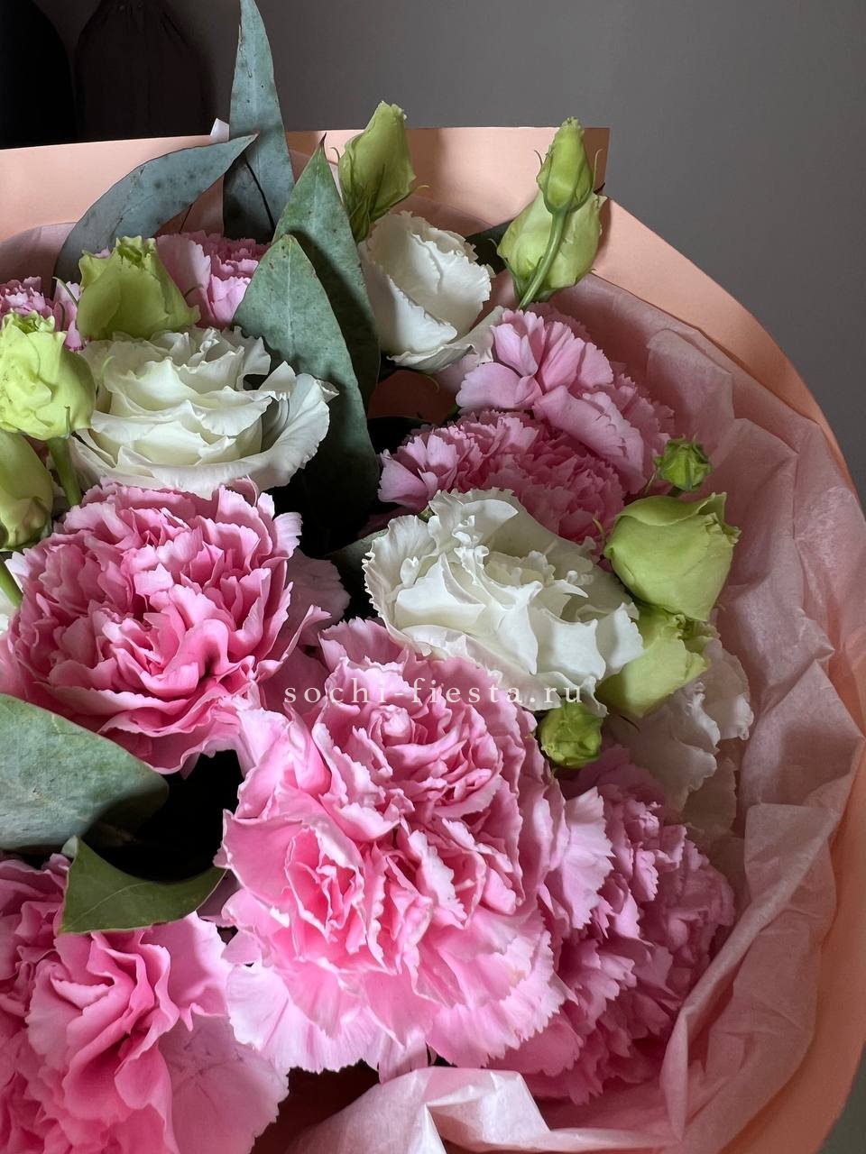 диантус, эустома, хризантема, белая роза, эвкалипт, упаковка.