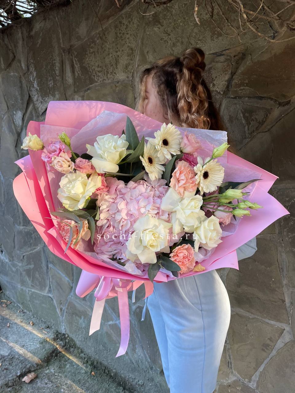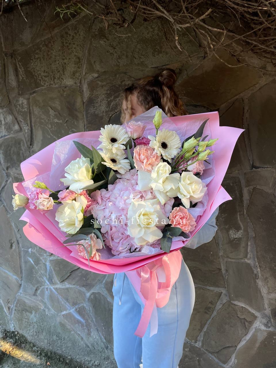 роза одноголовая, кустовая роза, альстромерия, гортензия, эустома, эвкалипт, декоративная зелень, лента, крафт.