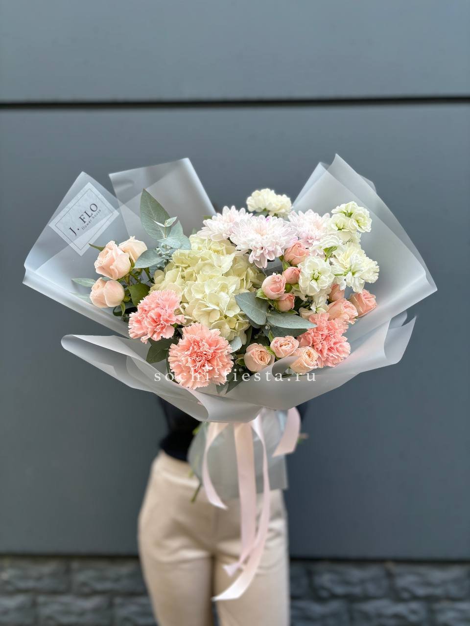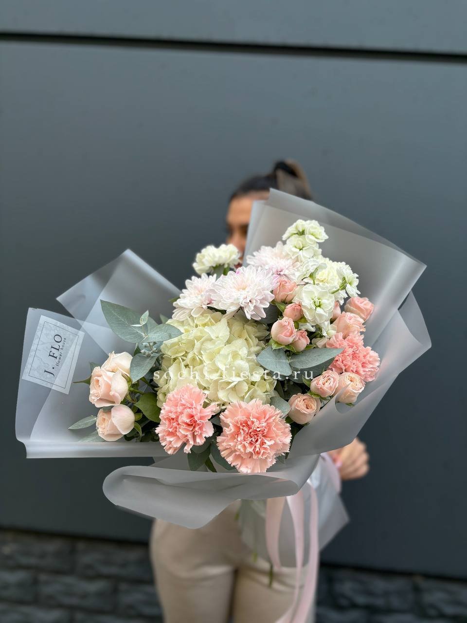 гортензия, роза одноголовая, бомбастик, декоративная зелень, эвкалипт, лента, дизайнерская упаковка.