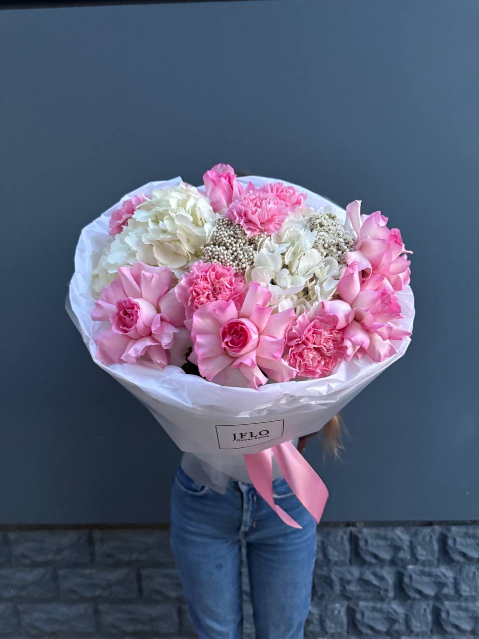 Крупные шапки гортензии окружены россыпью кустовых роз и эустомы. Композиция наполнена объемом и удерживает форму благодаря плотной сборке цветов разной высоты.